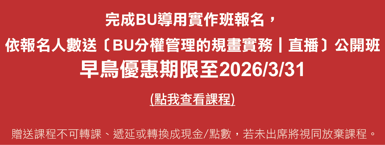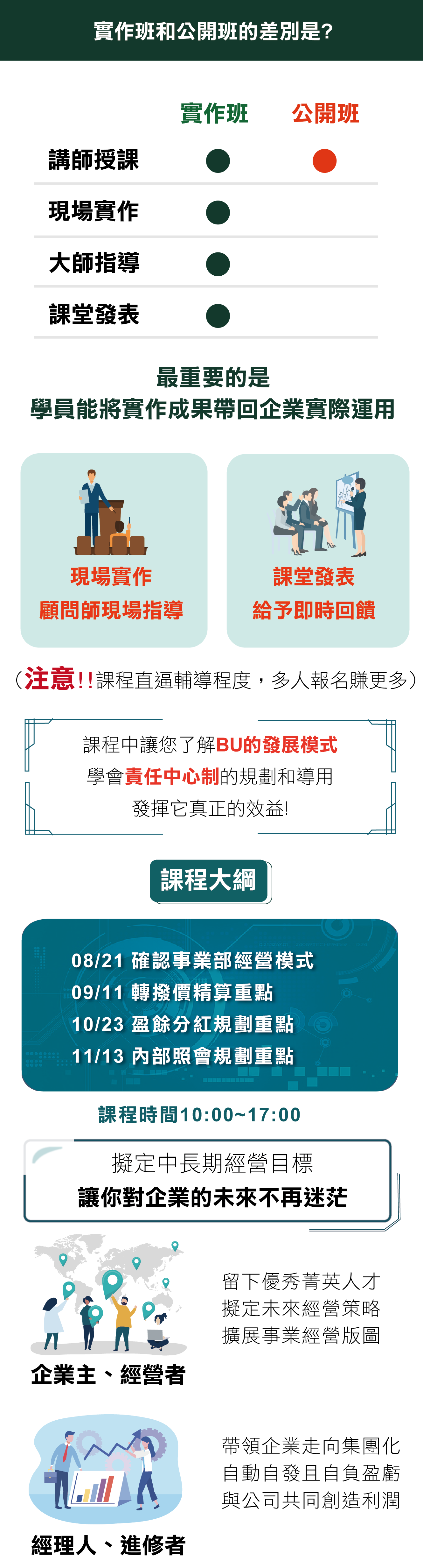 課程大綱 企業採用BU事業部制最大效益是激發全員責任意識,藉由中心與總部互相合作,為企業創造最大貢獻;透過分權管理與讓利制度設計,留下菁英團隊一起共創價值、共享利潤。