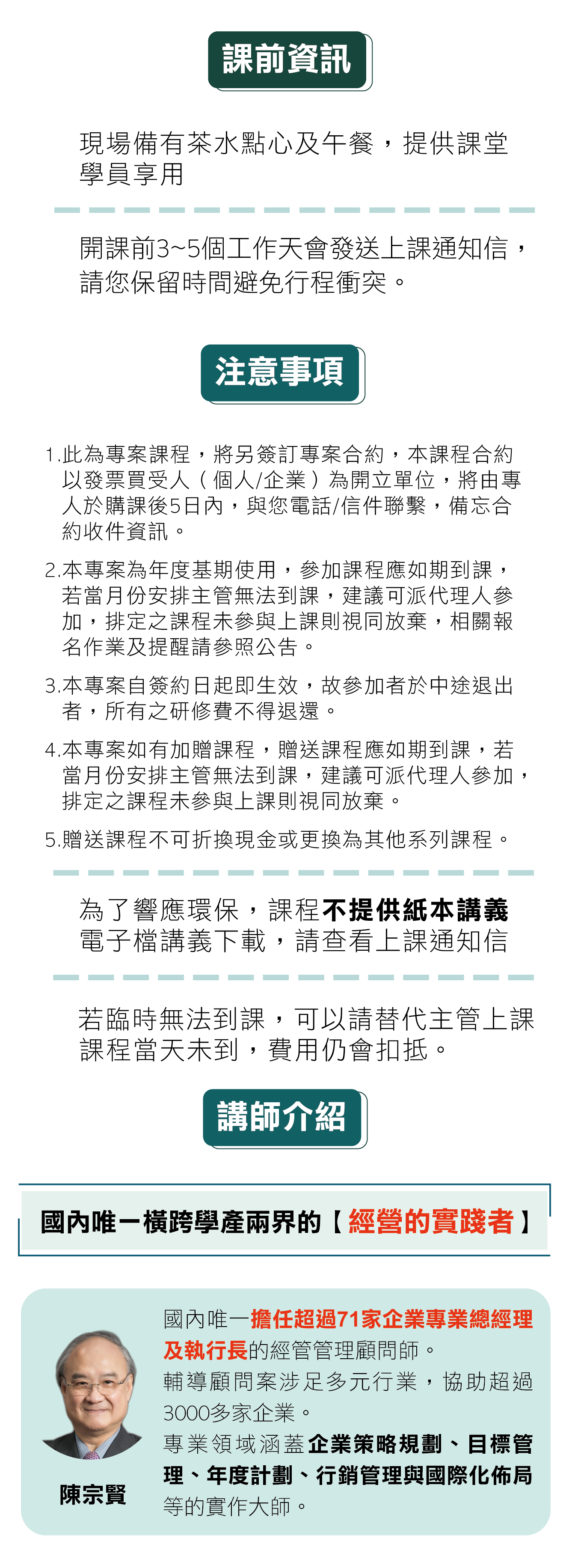 如何讓企業團隊有向心力,能自動自發地發揮自負盈虧的經營成效,本課程即是用手把手的方式教用與實作的現場完成分權管理的經營制度,留住人才共同創造企業高效。