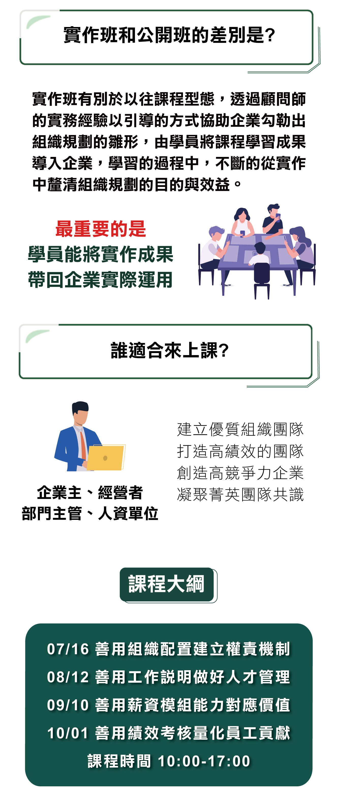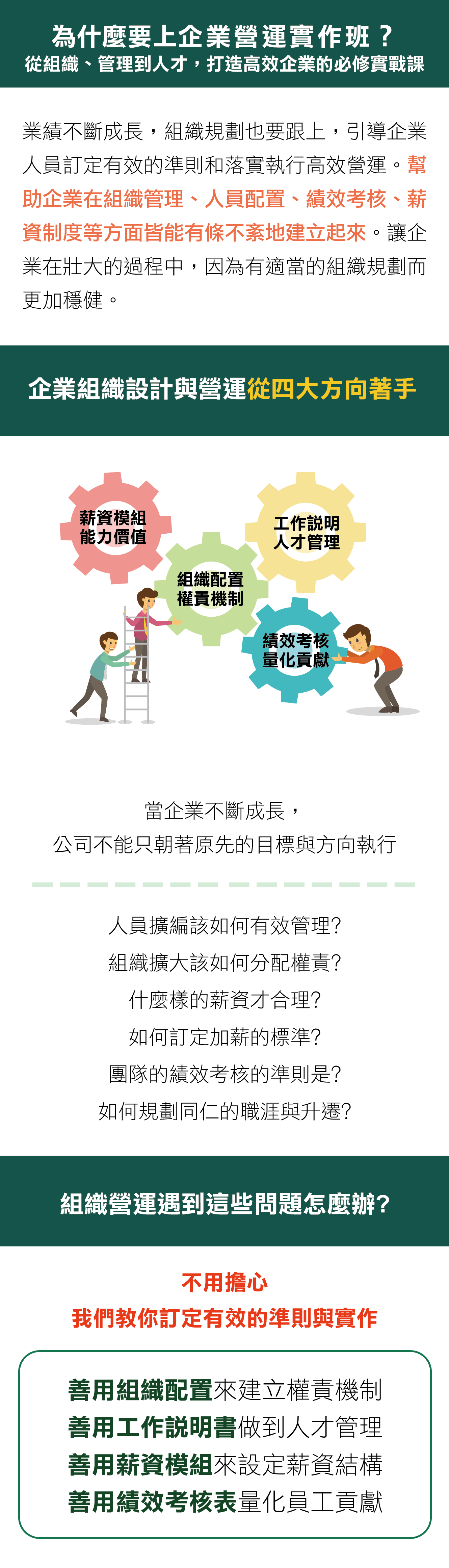 課程大綱 業績不斷成長,組織規劃也要跟上,教練式的教學方式引導企業人員訂定有效的準則和落實執行。幫助企業在組織管理、人員配置、績效考核、薪資制度等方面皆能有條不紊地建立起來。讓企業在壯大的過程中,因為有適當的組織規劃而更加穩健。