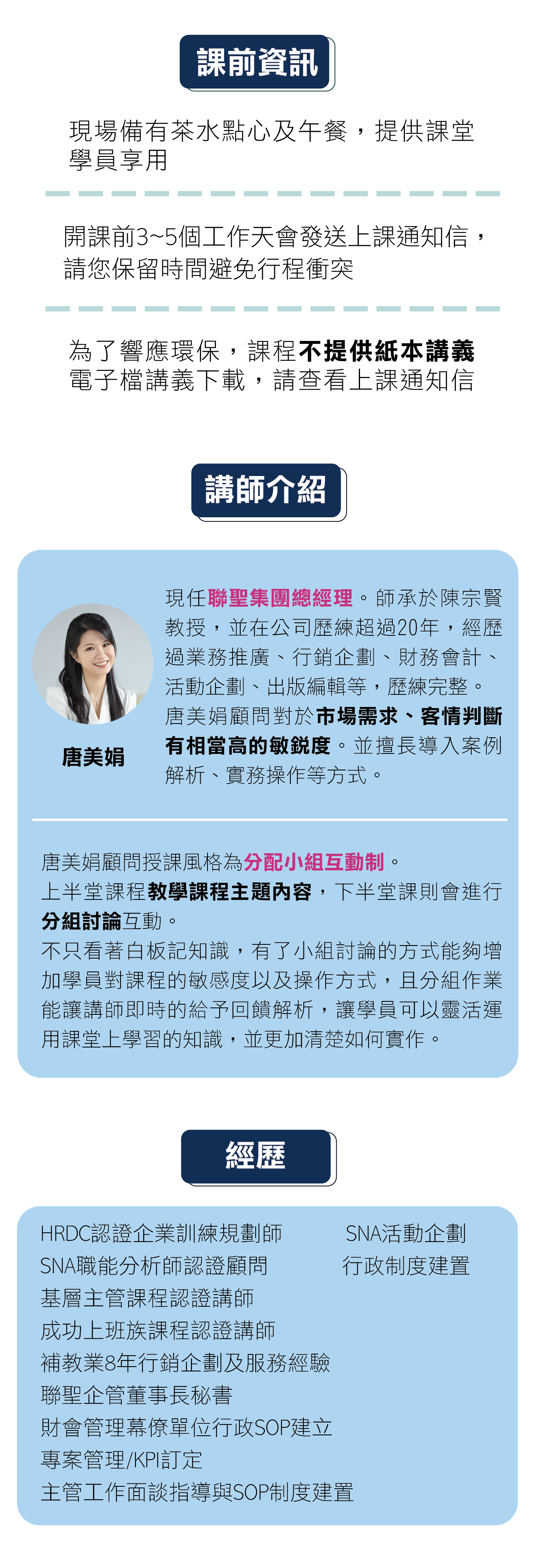 課程對象 1.中階主管、部門主管、專案負責人 2.領導多部門協作、需解決跨部門問題者 3.想提升團隊「解決力」與「執行力」的管理者