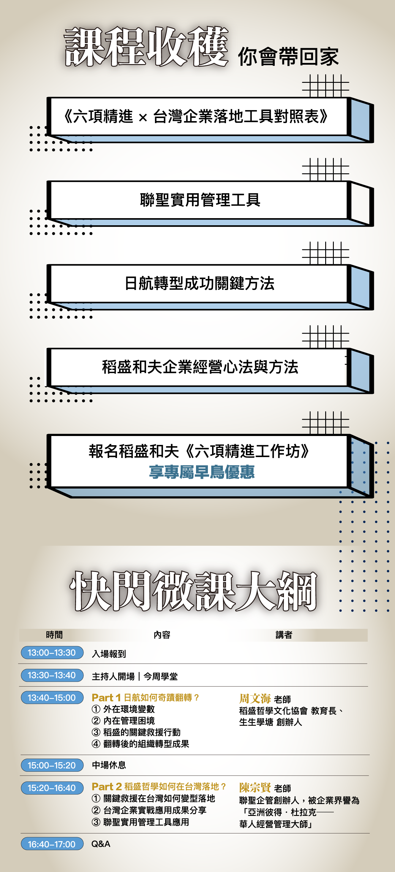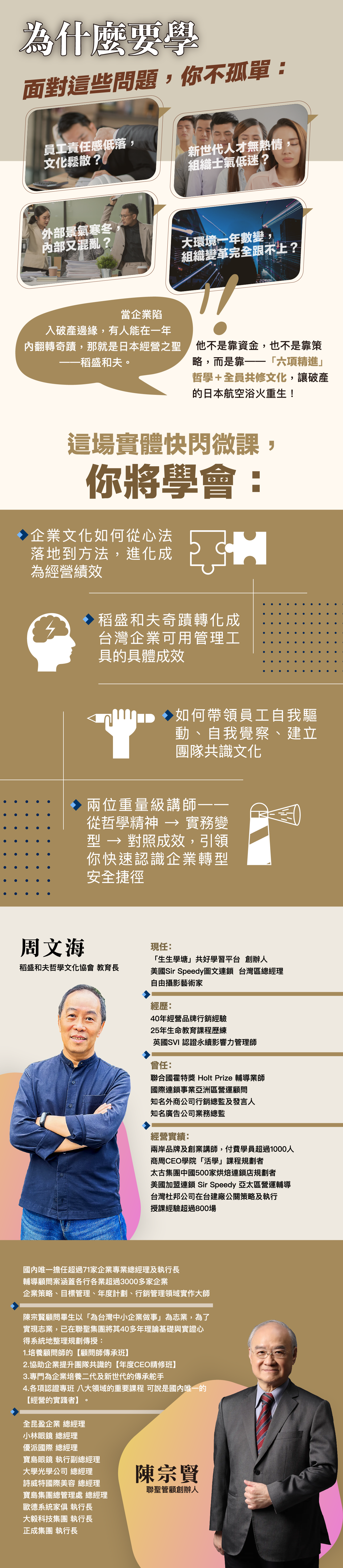 課程大綱 Part 2|稻盛哲學如何在台灣落地?① 關鍵救援在台灣如何變型落地② 台灣企業實戰應用成果分享③ 聯聖變型管理工具如何融合哲學