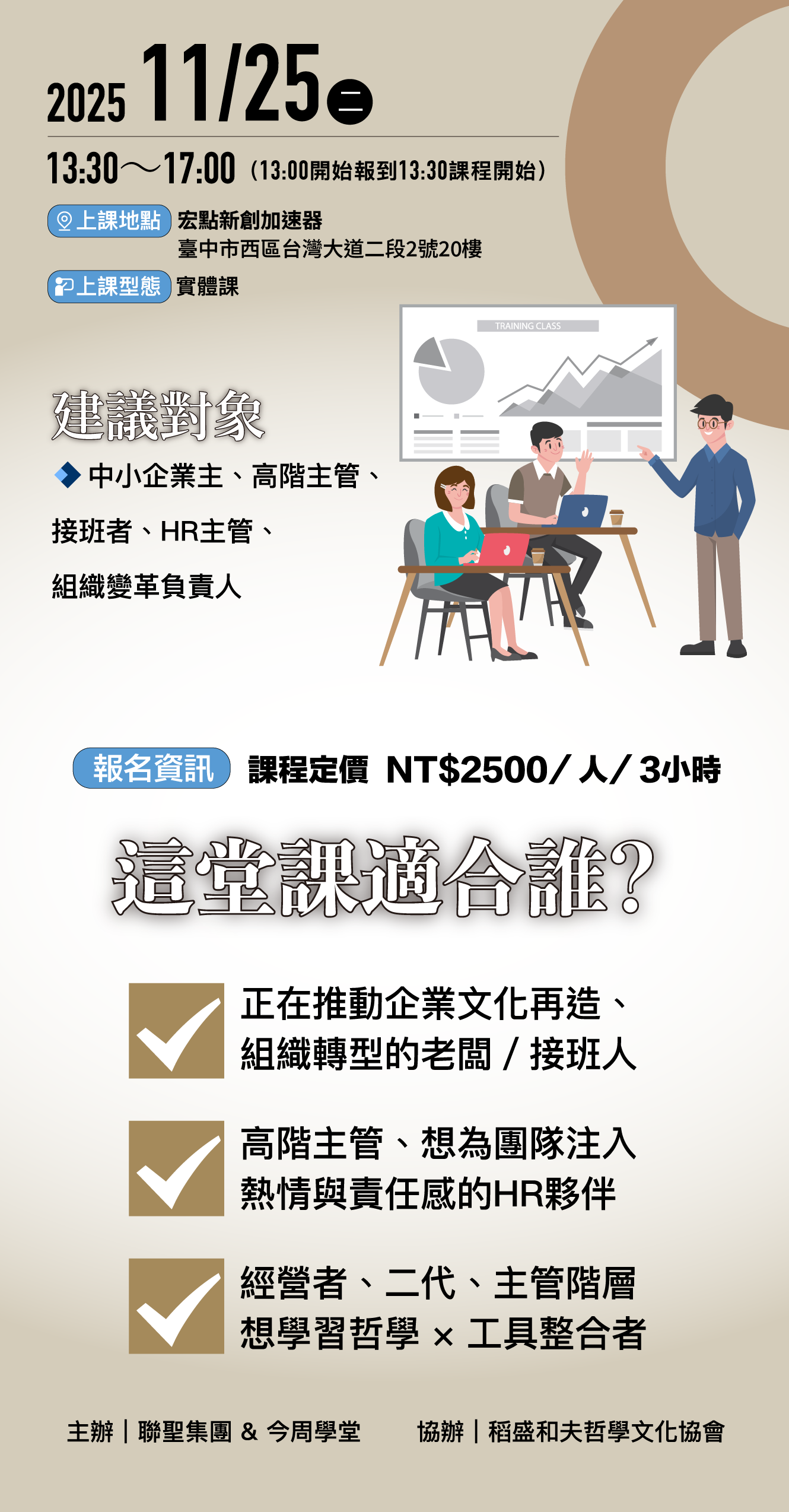 課程對象 中小企業主、高階主管、接班者、HR主管、組織變革負責人