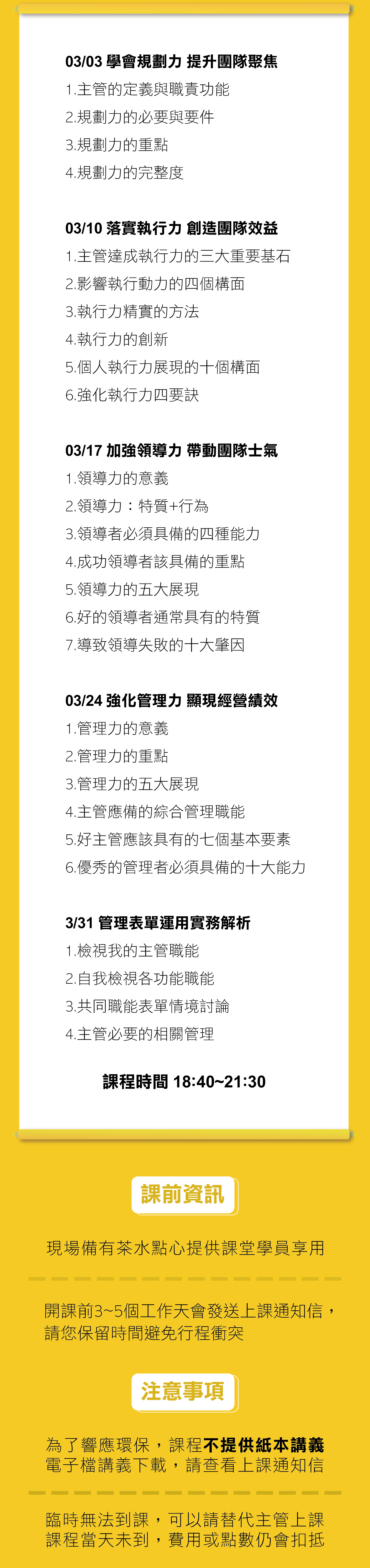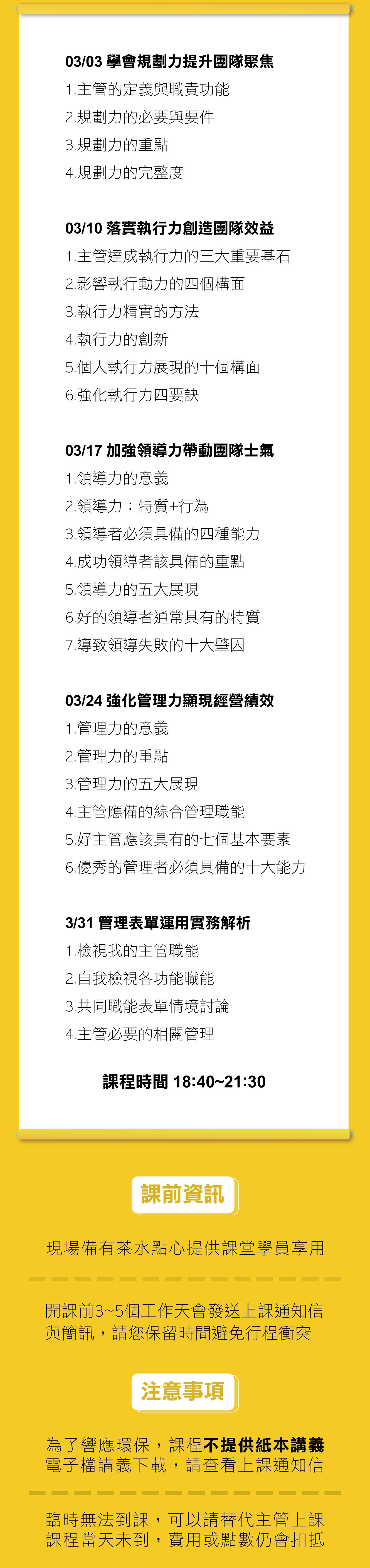 1.主管達成執行力的三大重要基石 2.影響執行動力的四個構面 3.執行力精實的方法 4.執行力的創新 5.個人執行力展現的十個構面 6.強化執行力四要訣