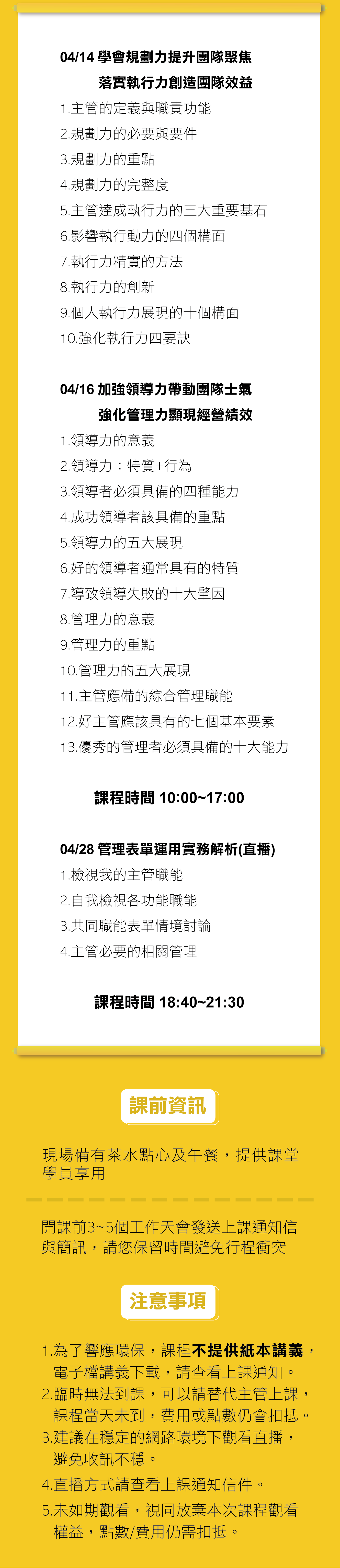 1.主管的定義與職責功能 2.規劃力的必要與要件 3.規劃力的重點 4.規劃力的完整度 5.主管達成執行力的三大重要基石 6.影響執行動力的四個構面 7.執行力精實的方法 8.執行力的創新9.個人執行力展現的十個構面 10.強化執行力四要訣