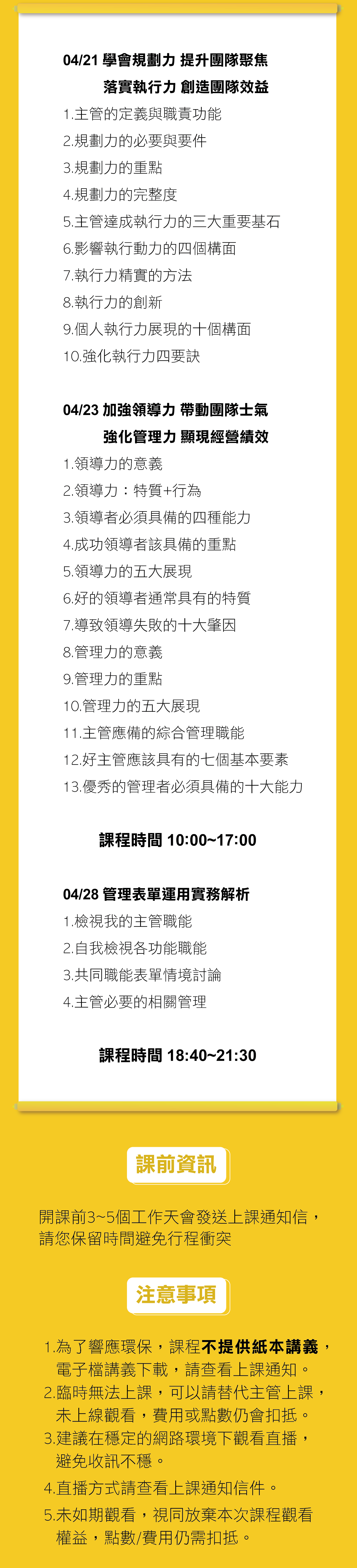 課程大綱 1.主管的定義與職責功能 2.規劃力的必要與要件 3.規劃力的重點 4.規劃力的完整度 5.主管達成執行力的三大重要基石 6.影響執行動力的四個構面 7.執行力精實的方法 8.執行力的創新9.個人執行力展現的十個構面 10.強化執行力四要訣