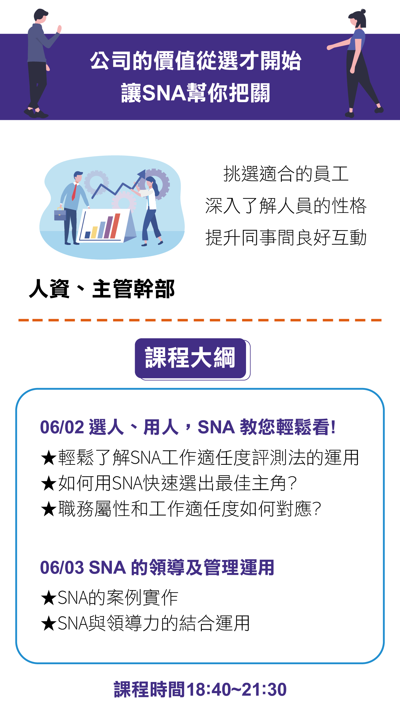 課程大綱 1.輕鬆了解SNA工作適任度評測法的運用 2.如何用SNA快速選出最佳主角? 3.職務屬性和工作適任度如何對應?