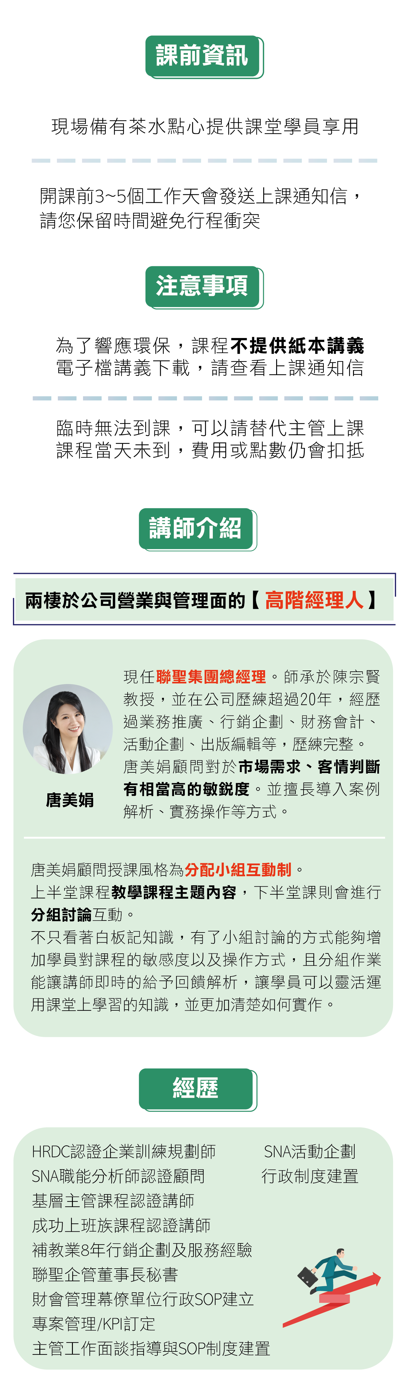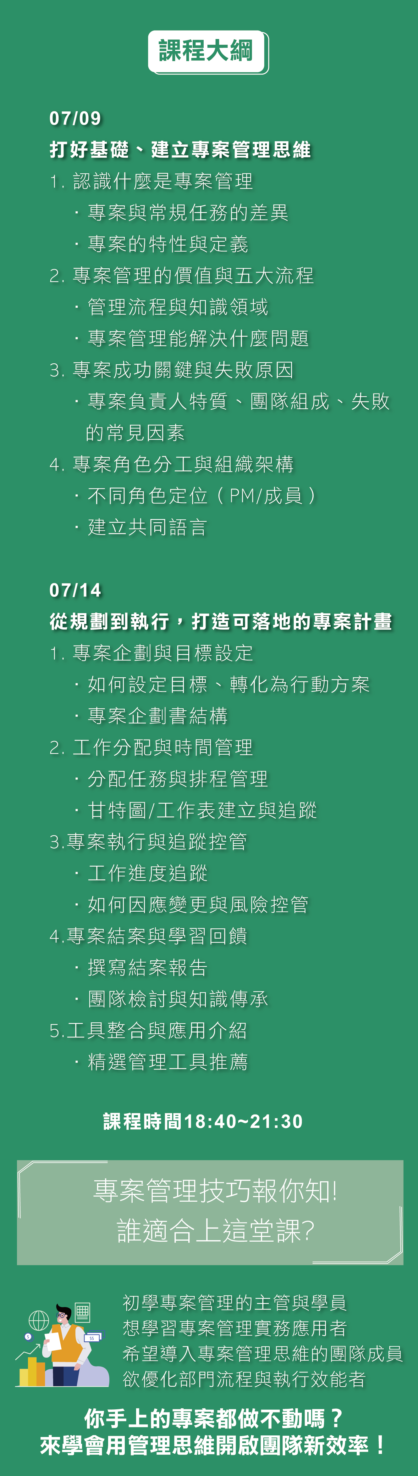 從規劃到執行,打造可落地的專案計畫 2026/07/14 唐美娟 老師