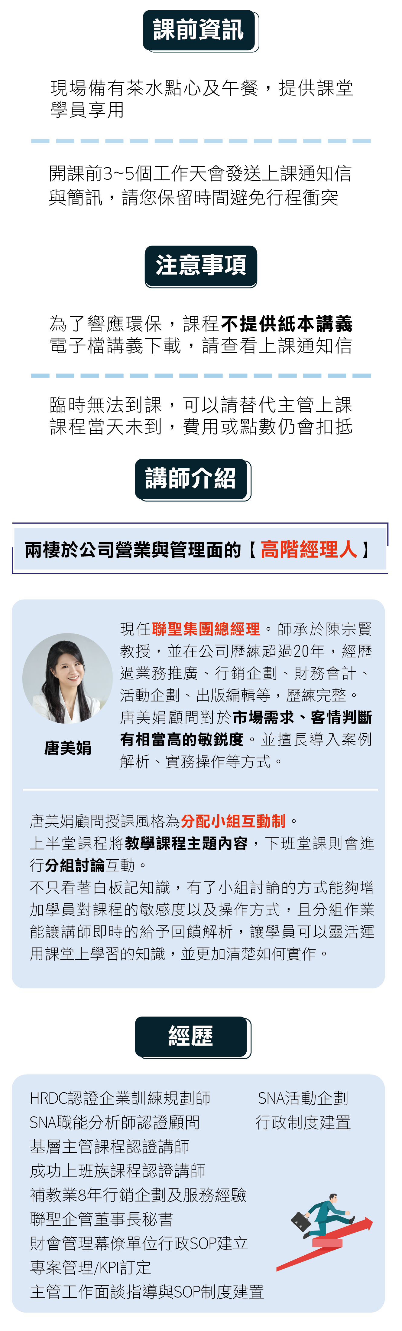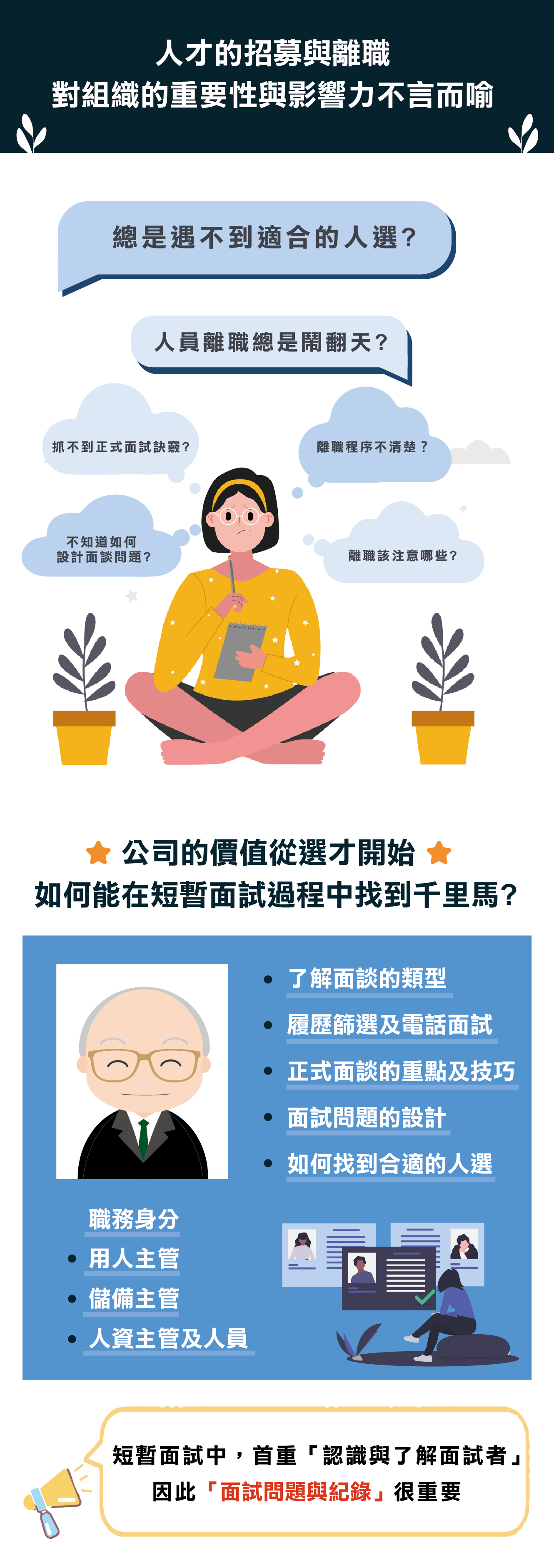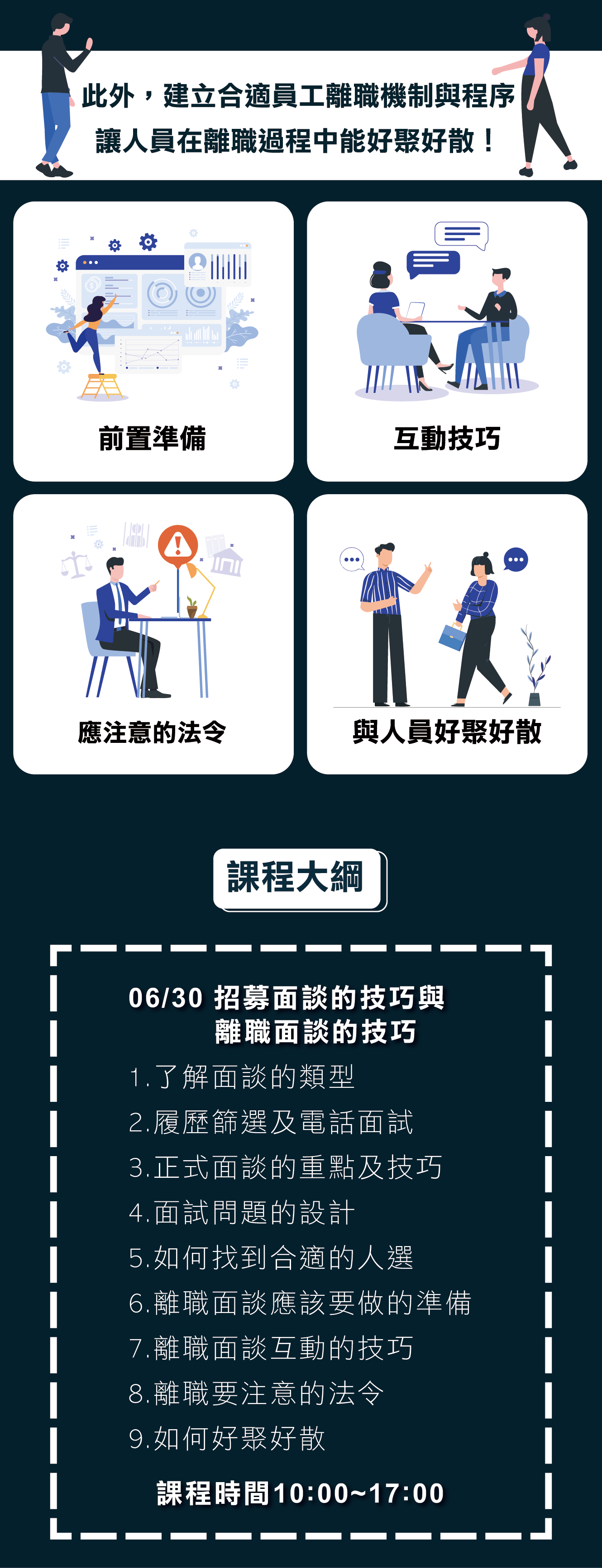 1.了解面談的類型 2.履歷篩選及電話面試 3.正式面談的重點及技巧 4.面試問題的設計 5.如何找到合適的人選 6.離職面談應該要做的準備 7.離職面談互動的技巧 8.離職要注意的法令 9.如何好聚好散
