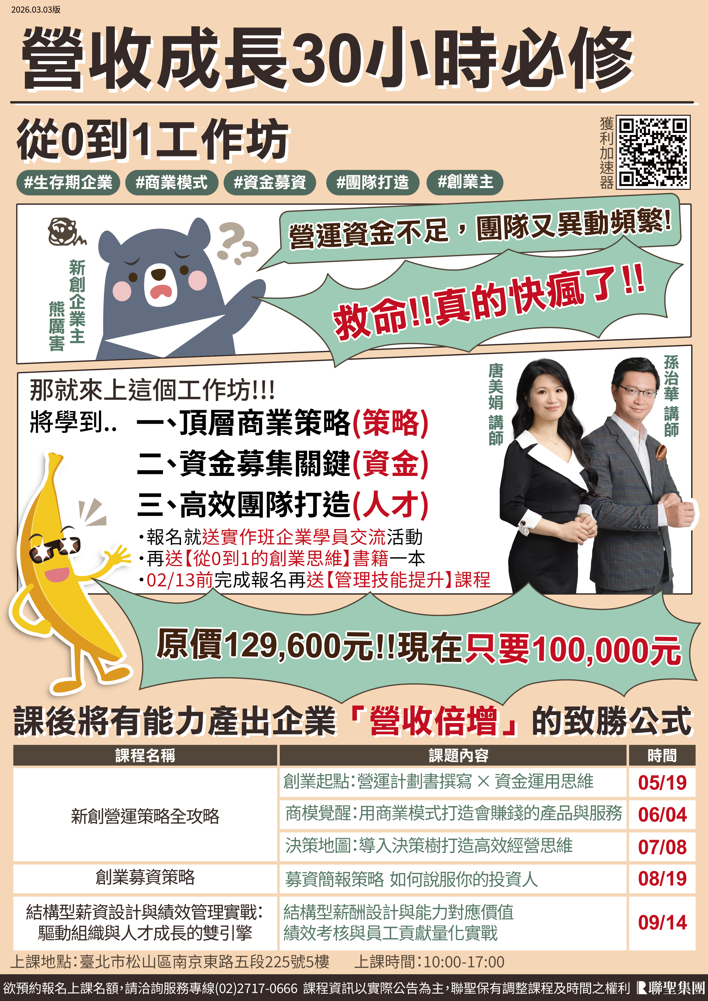 系列商品: 營收成長30小時必修-從0到1工作坊|台北
