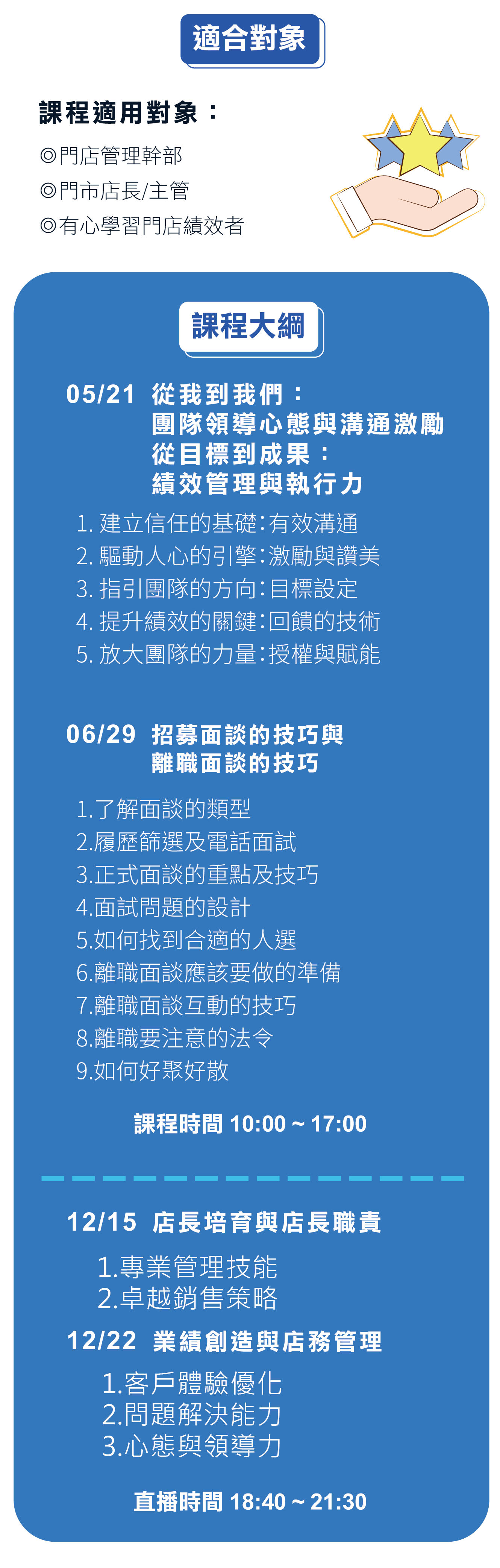 課程對象 1. 零售流通業的幹部與主管 2. 創業的老闆 3. 連鎖業的人資主管幹部