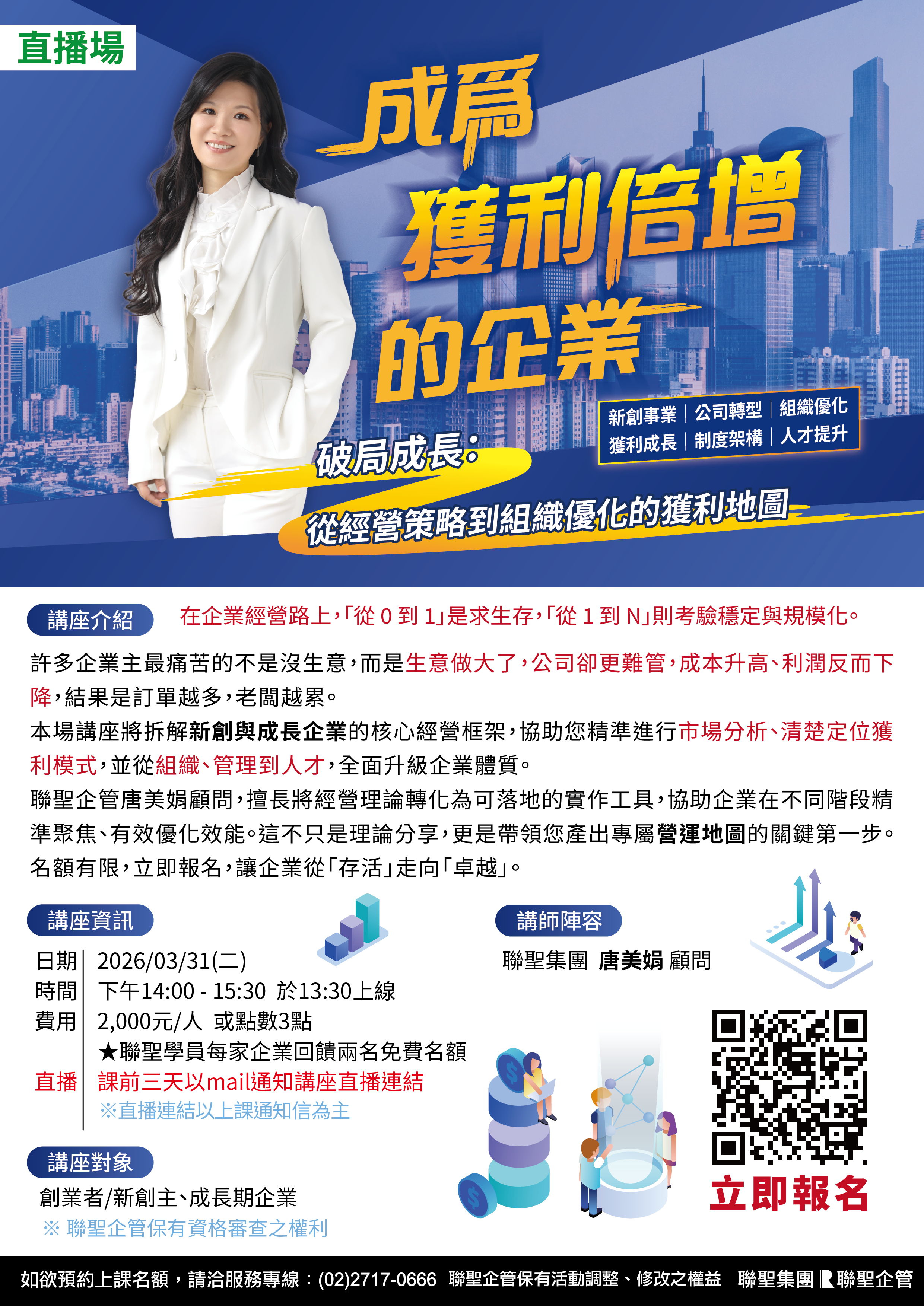 這場講座將拆解「新創事業」的核心框架,助您精準做市場分析、定位獲利模式;並從組織、管理到人才,全面升級您的企業體質。聯聖企管唐美娟顧問,擅長將經營理論轉化拆解為「可落地的實作工具」,協助企業在不同階段精準聚焦並優化效能,這不只是理論分享,更是帶領您產出專屬營運地圖的關鍵第一步。名額有限,立即報名,讓您的企業從「存活」走向「卓越」!